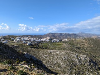 Chora, Amorgos, avril 2023. Le bourg est à trois milles du port à l’Ouest, bâti en amphithéâtre autour d’un rocher où est le vieux château des Ducs de l’Archipel qui ont possédé Amorgos pendant longtemps. TOURNEFORT 1717