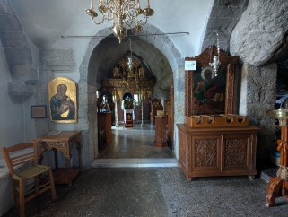 Chapelle de l'Apocalypse, Patmos, avril 2025. Cette chapelle n'a que huit ou neuf pas de long, sur cinq pas de large. La voute en est belle, quoique d'un cintre un peu gothique.