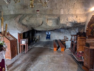 Grotte de l'Apocalypse, Patmos, avril 2025. On fait remarquer aux étrangers tout au haut de cette entrée une fente dans la roche vive, et ces bonnes gens croient que ce fut par là que la voix du Saint Esprit se fit entendre à saint Jean ; la grotte est basse et n'a rien de particulier.