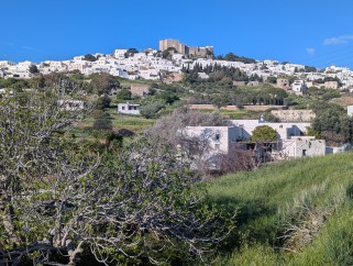 Profitis Ilias, Patmos, avril 2025. Elle ne manque pas de roches ni de montagnes, dont la plus élevée s'appelle Saint Hélie.