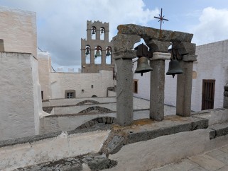 Couvent de Saint Jean, Patmos, avril 2025. l n'y a rien de plus rare que deux grosses cloches qui sont au-dessus de la porte de la maison, car c'est une chose bien particulière dans le Levant que de grosses cloches. Comme les Turcs ont de la vénération pour saint Jean, ils laissent jouir les caloyers de Patmos de cet avantage.