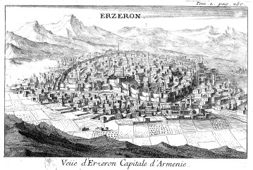 "C'est une assez grande ville à cinq journées de la mer Noire, et à dix de la frontière de Perse. Erzeron est bâti dans une belle plaine au pied d'une chaîne de montagnes qui empêchent l'Euphrate de se rendre dans la mer Noire et l'obligent de se tourner du côté du Midi. Les collines qui bordent cette plaine étroite étaient encore couvertes de neige en plusieurs endroits. On nous assura même qu’il en était tombé le premier jour de juin, et nous étions fort surpris d’avoir les mains engourdies jusqu’à ne pouvoir écrire sur le point du jour : cet engourdissement durait encore une heure après le lever du soleil, quoique les nuits y fussent assez douces & les chaleurs incommodes depuis les dix heures du matin jusques à quatre heures après midi (...).
