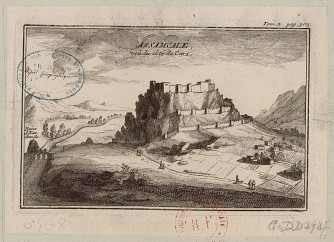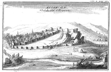 Le 27 août, nous marchâmes près de six heures et nous retirâmes à Lavender, village peu considérable. Le 28, après une route aussi longue, on arriva aux bains d'Assamcalé [=Hasankale, à Pasinler] bâtis assez proprement sur le bord de l'Araxe, à une petite journée d'Erzeron (...). Au milieu de la plaine d'Assancalé s'élève une roche horriblement escarpée, sur laquelle on a bâti la ville et une forteresse qui menace tous les environs, et où on appréhende plus la famine que le canon (...). Les murailles sont comme en limaçon tout autour de la roche, flanquées sur des tours carrées, dont le canon empêcherait les approches s'il était bien servi, car ces tours ne sont pas plus élevées que les murailles, et paraissent comme des plateformes.