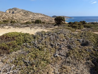 Pistacia lentiscus, Donoussa, octobre 2022. Il est couvert de Lentisques, de Kermes, de Cistus...