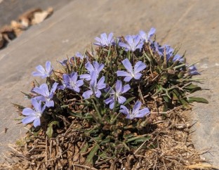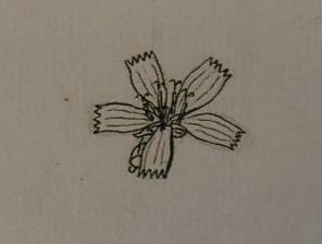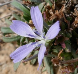 Sa racine est grosse comme le pouce et quelquefois davantage, longue d’un pied ou 2, divisées en fibres peu chevelues, blanchâtres en dedans et ligneuses, couvertes d’une écorce brune, gercée, laiteuse, ainsi que le reste de la plante. Elle porte plusieurs tiges tortues, brunes aussi, dures, touffues, entrelacées les unes avec les autres, toutes garnies de vieux piquants branchus et roussâtres, des anciennes branches mortes et sans feuilles, parmi lesquelles il y en a de vives, épaisses de 2 lignes, qui se divisent en branches touffues, vert de mer, lisses, terminées en piquant fort dur. A la base de ces tiges il y a quelques feuilles longues de 3 pouces, lisses, vertes, relevées d’une grosse côte en-dessous, larges de 7 ou 8 lignes, découpées comme celles de la Dent de Lion, avec les crochets tournés vers la base, [], longues d’environ 3 pouces. Les subdivisions des branches ont des feuilles très menues, et les dernières même n’ont qu’une ligne ou 2 de long. Les fleurs naissent parmi les piquants à l’extrémité des branches. Elles sont le plus souvent à 5 demi-fleurons, bleu pâle, larges d’un pouce. Chaque demi-fleuron est long de 7 ou 8 lignes sur 3 de large, la base en est fistuleuse, et laisse échapper une graine très menue, blanchâtre, au-delà de laquelle s’échappe un filet à 2 cornes recourbées. Le bout des demi-fleurons est équarri et crénelé. Le calice est une espèce de tuyau long de 4 lignes sur [une] de large, à deux rangées de feuilles, dont les inférieures sont comme des [écailles] placées sur les autres, mais les supérieures sont plus longues, et 5 en nombre. [ ] Cette plante fait un buisson très épais, touffu, étendu et tapi sur la terre. "