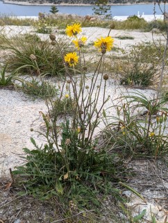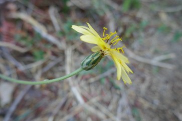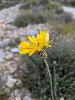 Hymenonema graecum L., Naxos, octobre 2020. Le calice est une poire longue d’un pouce sur 7 ou 8 lignes d’épaisseur, composée de plusieurs écailles vert pâle ou rouges vers le milieu, mais blanches membraneuses sur les bords.