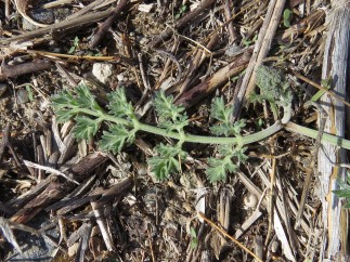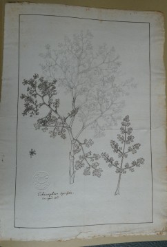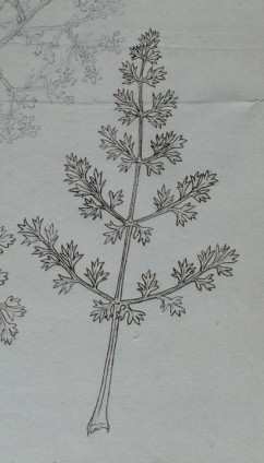 Sa racine vient de profond et on ne saurait l’arracher toute entière. Celle qui reste ordinairement aux tiges que l’on arrache est grosse comme le pouce, douceâtre, blanc sale, d’une odeur qui participe du Fenouil et de l’Anis, ainsi que toute la plante. La tige est haute d’un pied et demi, épaisse de 5 lignes, tortue en zigzag, vert pâle, légèrement velue, plein de moelle blanche, branchue quelquefois dès sa naissance, avec les branches fort étendues sur les côtés et qui se divisent en plusieurs brins formant une touffe et arrondie comme un petit buisson. Les premières feuilles sont presque couchées sur terre, longues de demi-pied sur 5 pouces de large, vert blanchâtre, légèrement velues, assez semblables à celles du Persil de Macédoine [= maceron], mais incisées un peu plus profondément. Les [pinnes ?] ou feuilles en particulier étant longues de demi-pouce, attachées à une côte sillonnée ainsi que dans les plantes ombellifères, et cette côte embrasse la tige par une base blanchâtre et cannelée. Ces feuilles sont