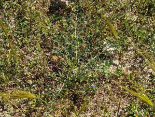 Echinophora tenuifolia L. subsp. sibthorpiana (Guss.) Tutin, Milos, octobre 2021. Photo Jean-Pierre Brizard. Les premières feuilles sont presque couchées sur terre, vert blanchâtre, légèrement velues, assez semblables à celles du Persil de Macédoine, mais incisées un peu plus profondément.