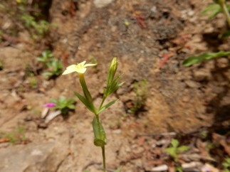 Cette plante a pour racine un filet blanc et chevelu, long d’un pouce et demi. Sa tige n’a que 4 ou 5 pouces de haut, carrée, avec des feuilles 2 à 2 à chaque nœud, longues de 4 lignes sur 2 ou 3 de large, semblables à celles de la centaurée commune. De leurs aisselles naissent 2 ou 3 petits brins déliés dont chacun soutient une fleur céladon qui est un jaune citrin tirant sur le verdâtre, longue d’abord de 7 ou 8 lignes, puis d’un pouce, dont les 2 tiers font un tuyau évasé sur le devant et divisé en 5 parties longues de 3 lignes, pointues, lesquelles étant épanouies font u bassin de 4 ou 5 lignes de diamètre. Le pistil est un cylindre vert gai, surmonté d’un filet fourchu qui rempli tout le tuyau de la fleur, de l’ouverture de laquelle sortent 6 étamines fort courbées avec un sommet citrin. Le calice est un tuyau divisé en 5 parties fort pointues. Cette plante n’est pas fort amère. "