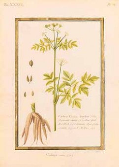 Ses racines sont des navets épais comme le doigt, longs de 3 pouces, terminés par une queue ou filet presque aussi long, leur chair est blanche en dedans, d’un goût aromatique, couverte d’une peau mince et brune. De ces racines qui sont un peu fibreuses sortent des feuilles semblables à celles de l’Angelica sylvestris minor sive erratica B. p., vert pâles, luisantes, aromatiques. La tige est haute d’un pied et demi, pleine de moelle blanche, épaisse de 3 ou 4 lignes, droite, ferme, cannelée, garnie à chaque nœud de feuilles semblables aux premières, mais plus petites. La fleur de cette plante était passée, mais les graines qui commençaient à se former nous firent bien connaître que c’était une espèce de Cachrys, car ces graines étaient longues de demi pouce, épaisses de 3 ou 4 lignes, cannelées, couvertes d’un duvet âpre, semblable à celui qui est sur les graines du Cachrys semine sulcato aspero foliis Peucedani Mor. "