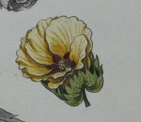 La racine pique en fond, longue de 8 ou 9 pouces, quelquefois davantage, accompagnée de quelques fibres blanc sale en dehors, tirant sur le roussâtre. La tige est haute de 12 ou 13 pouces, velue vers le haut, droite, épaisse de 2 lignes, vert marbré de pointes noires, rougeâtre d’un côté, garnie alternativement de feuilles presque rondes, mais découpées en 5 quartiers larges de 4 pouces, semblables en quelque manière à celles de la Vigne, mais leurs bords ne sont pas crénelés, et les pointes des quartiers sont obtuses. Les feuilles sont vert tirant sur le brun, soutenues par un pédicule long de 2 pouces et demi, épais d’une ligne, vert pâle, rougeâtre en quelque endroit, qui fournit un gros nerf à chaque quartier. Les feuilles sont d’un goût styptique dans lequel on découvre quelque chose d’aigrelet. Des aisselles de ces feuilles, presque dès le bas, sortent des branches longues de 2 ou 3 pouces, velues, au bout desquelles sortent ordinairement une feuille ou deux, semblables aux autres, mais plus petites, et vis-à-vis du pédicule de cette feuille il en sort un autre, quelquefois deux, rougeâtres, longs d’un pouce, qui soutiennent chacun une fleur de même structure que celle de la mauve, longue d’un pouce et demi, partagée en 5 gros quartiers arrondis, jaunâtres, purpurin sale sur les bords, jaune pâle en dedans, avec une grosse tache purpurin foncé, luisante et comme cannelée et frangée, au bas de chaque quartier. Du fond de la fleur s’élève un tuyau blanc sale long de 7 ou 8 lignes chargé d’étamines de même couleur, dont les sommets sont jaunes. C’est dans ce tuyau que s’articule le pistil, qui est un bouton vert gai, conique, long de 4 ou 5 lignes, et à 4 coins. Le calice est une coupe vert pâle piquée de noir, légèrement crénelée sur les bords, entourée à la base d’une feuille en bassin, longue d’un pouce, partagée en 3 pièces jusque vers le centre, chaque pièce étant arrondie en oreillette dans l’endroit où elle fait le pli avec sa voisine. Ces pièces d’ailleurs sont découpées à grosses crénelures, fort pointues ; à la base des pédicules des fleurs il y a deux feuilles larges d’une ligne, longues de demi-pouce. "