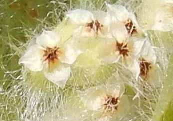 Sa racine est droite, longue de 3 ou 4 pouces, roussâtre accompagnée de chevelu, épaisse d’une ligne. Elle produit plusieurs feuilles longues de 3 pouces sur 3 lignes de large, nervées légèrement, et considérablement velues. Du milieu de ces feuilles s’élèvent 12 ou 15 tiges hautes seulement d’un pouce, épaisses d’une ligne, couvertes d’un gros coton blanc et fin dont les poils ont 3 ou 4 lignes de long. Chaque tige soutient une tête assez ronde, de 2 ou 3 lignes de diamètre, cotonneuse, aussi entremêlée de quelques petites feuilles, longues de 2 lignes, parmi lesquelles naissent des fleurs longues de 2 lignes. Chaque fleur est un tuyau membraneux, divisé en devant en 4 parties renversées sur les côtés, pointues, longues d’une ligne, blanchâtres, mais le tuyau est roussâtre à son ouverture. Les étamines sont aussi au nombre de 4, fort déliées, et débordent de près de 3 lignes au-delà de la fleur, chargées d’un sommet roussâtre. Le pistil est long de deux lignes, et devient enfin le fruit. "