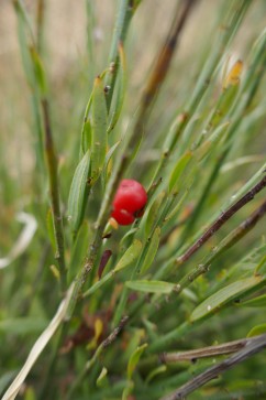 Son fruit est une baie de 4 lignes et demie de diamètre, sphérique, rouge, luisante, polie, creusée en devant en manière de petit nombril comme triangulaire, large d’une ligne. La chair qui couvre cette baie est douce, fade, épaisse d’une ligne, orangée, pleine de suc, et couvre un noyau ou coque un peu osseuse, roussâtre, sphérique, pleine d’une substance blanche, charnue, fade. Il apparaît par le nombril de cette baie que l’embryon était le calice devenu le fruit. C’est à ce nombril que tenait la fleur, composée de trois feuilles fort petites, ou divisée au moins jusqu’au coeur en 3 parties fort petites. "