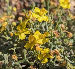 Verbascum spinosum L., Anopoli, Crète, juillet 2023. Chaque fleur est une rosette divisée en 5 quartiers arrondis, dont il y en a 3 tant soit peu plus grands que les 2 autres, jaune pâle.