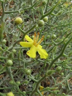 Cette plante fait un buisson haut d’environ un pied, à plusieurs tiges ligneuses qui ont 3 ou 4 lignes d’épaisseur, grisâtres, gercées, et qui se divisent et subdivisent en plusieurs branches, qui poussent vers leur sommité et sur les côtés des jets hauts de 3 ou 4 pouces, épais d’une ligne, verdâtres, couverts d’un duvet blanc, accompagnés de feuilles posées alternativement et clairsemées, [ ] longues de 8 ou 9 lignes sur une ligne et demie ou 2 de large, vert cendré [ ] à 4 ou plusieurs dents longues d’une ligne sur 2 lignes de large. Elles sont oblongues, pointues au bout, rétrécies en bas en manière de pédicule long de près de 4 lignes, assez semblables à celles du Leucoium maritimum thlaspifolium B. p., mais pliées ordinairement en gouttière, un peu amères quand on les mâche, ondées sur les bords. De leurs aisselles sortent 3 ou 4 feuilles beaucoup plus menues, ramassées en bouquet. Toutes les branches se terminent par des piquants minces, longs d’un pouce ou d’un pouce et demi, accompagnés quelquefois de quelques autres plus petits. Le fleurs naissent vers l’extrémité de ces piquants sur des pédicules longs de 3 ou 4 lignes, qui après que la fleur est passée se durcissent et deviennent souvent d’autres piquants. Chaque fleur est une rosette large de 6 ou 7 lignes, divisée en 5 quartiers arrondis, dont il y en a 3 tant soit peu plus grands que les 2 autres, jaune pâle. Elle est percée au milieu et s’emboîte avec un pistil long de demi-ligne, qui devient ensuite un fruit ovale, pointu, épais d’une ligne sur une ligne et demie de long, surmonté d’un filet long de 2 lignes terminé par un petit sommet. Du milieu de la fleur s’élèvent 3 étamines jaune orangé, couvertes de petits poils blanchâtres et surmontées de sommets très minces de même couleur. Le calice est long d’une ligne et demie, d’une seule pièce, partagé en 5 quartiers, un peu velu, vert pâle. Les premières feuilles des jeunes plantes sont assez semblables à celles du Botrys, mais plus blanches. Il y en a ensuite de beaucoup plus étroites, ondées et dentées sur les bords. "