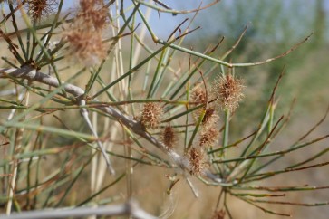 C'est un arbuste de trois ou quatre pieds de long, fort touffu et fort étendu sur les côtés, son tronc est tortu, dur, cassant, épais comme le bras, couvert d'une écorce roussâtre, divisé en branches tortues aussi, subdivisées en rameaux d'où naissent, au lieu de feuilles, des brins cylindriques épais de demi ligne vert de mer, longs d'un pouce ou 15 lignes, composés de plusieurs pièces articulées bout à bout, si semblable aux feuilles de l'Ephedra , qu'il n'est pas possible de les distinguer sans voir les fleurs. Des articulations de ces brins il en sort d'autres qui sont articulés de même, et ces derniers poussent dans leur longueur quelques fleurs de trois lignes de diamètre. Ce sont des bassins découpés en cinq parties jusque vers le centre, vert pâle dans le milieu, et blancs dans le reste. Du fond de chaque bassin sort un pistil long d'une ligne et demie, anguleux, relevé de petites arrêtes et entouré d'étamines blanches dont les sommets sont purpurins. Chaque fleur est soutenue par un pédicule très délié et fort court. Le pistil devient un fruit long d'environ demi pouce, épais de quatre ligne, de figure conique, cannelé profondément dans sa longueur. Les cannelures sont parfois droites, quelquefois spiralées. Leurs arrêtes sont terminées par des ailes découpées en franges, très menues. Quand on coupe le fruit en travers on en découvre la partie moelleuse, laquelle est blanche et angulaire. Les fleurs ont l'odeur de celles du tilleul, ne se flétrissent que tard, et restent à la base du fruit comme une espèce de rosette. Les feuilles ont un goût d'herbe, mais stiptique [astringent]. " TOURNEFORT 1717.