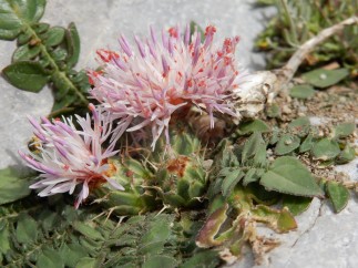 Jacea Cretica, acaulos, Glasti folio : " Sa racine est grosse comme le petit doigt, blanchâtre en dedans, mais couverte d’une écorce grisâtre avec la tête garnie des fibres des vieux pédicules des feuilles. De cette tête naissent des feuilles assez semblables à celles du Glastum [=Isatis tinctoria L.], longues de près de 4 pouces sur un pouce et demi de large, vert gai, crénelées légèrement sur les bords, leurs pédicules se termine par une grosse côte qui traverse la feuille. De la même tête s’élèvent une ou deux tiges hautes seulement de 2 ou 3 pouces, accompagnées d’une ou deux feuilles semblables aux précédentes, mais plus étroites. Cette tige est vert pâle, épaisse d’une ligne, et soutient une fleur à fleurons gris-de-lin lavé, divisé en 5 parties longues de 2 lignes et demie, fort étroites, du milieu desquelles sort une gaine violette surmontée par un filet fourchu. Les fleurons qui sont à la circonférence ne sont guère plus grands que les autres, mais ils sont un peu plus colorés. Le calice est en poire et a près d’une pouce de long sur 7 ou 8 lignes de large, formé par plusieurs écailles vert gai, lisses, terminées par une pointe qui ne pique pas. "