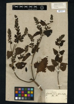 Sa racine est fibreuse, roussâtre, garnie de chevelu, et pousse quelques tiges cassantes, verdâtres en dedans, épaisses d’environ 2 lignes, dont les branches s’élèvent à un pied et davantage, accompagnées à chaque nœud de 2 feuilles semblables à celles de l’herbe aux chats ordinaire, 43 vert grisâtre surtout, longues de 2 ou 3 pouces sur un pouce et demi de large, crénelées à grosses crénelures presque arrondies, soutenues par un pédicule sillonné long d’environ un pouce. Des aisselles de ces feuilles naissent des branches touffues opposées en croix, vert pâle, garnies de feuilles semblables à celles que l’on vient de décrire,mais plus petites. Toutes ces branches se terminent par des épis longs de 4 ou 5 pouces, dont les feuilles sont en fer de pique, fort touffues, blanchâtres, longues seulement de demi pouce, et de leur aisselle sort de chaque côté une fleur blanc sale, légèrement velue, longue de demi pouce, dont le derrière est un tuyau coudé verdâtre. Le devant s’évase en manière de gorge et se divise en 2 lèvres. La supérieure est longue d’une ligne et demie, un peu creuse, obtuse, émoussée, échancrée. L’inférieure a 3 lignes de large, découpée en 3 pièces dont les 2 latérales bordent le trou de la gorge. La moyenne est la plus grande, convexe et arrondie. 4 étamines naissent des parois du tuyau, se courbent et accompagnent la lèvre supérieure, chargées d’un sommet jaunâtre, bordé de brun. Le pistil est au fond du calice, garni de 4 embryons et terminé par un filet fourchu. Ce calice est un tuyau tout velu, long seulement d’une ligne et demie, découpé en 2 lèvres dont la supérieure est relevée d’un casque troussé comme dans les autres espèces de ce genre. "