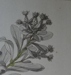 Cet arbuste sort des fentes des rochers par un tronc gros comme le bras, tortu, dépouillé de son écorce en plusieurs endroits ; grisâtre, gercé et semblable à du bois mort. Il est branchu dès le bas, fort tortu, cassant, haut d’un pied et demi ou deux, étendu sur les côtés en plusieurs branches dont l’écorce est raboteuse et noirâtre. De ces branches naissent des bouquets de 3 ou 4 feuilles semblables à celles de Plantago angustifolia, veinées, luisantes, amères, un peu gluantes, longues de deux pouces et demi, pointues par les deux bouts, assez charnues et cassantes. Du milieu de ces feuilles s’élèvent des rameaux qui n’ont ordinairement que 3 ou 4 pouces de long, quelquefois demi-pied, épais d’une ligne, vert gai, garnis de feuilles semblables aux précédentes, mais un peu plus petites. Chaque tige soutient un bouquet de 3 ou 4 fleurs, dont le calice est long de 8 ou 9 lignes sur deux de large, à plusieurs écailles vert pâle, quelquefois rougeâtres, et dont les bords sont un peu velus. Ce calice est renflé vers le milieu et les écailles qui sont à son extrémité forment cinq petites pointes en étoile, qui embrassent 7 ou 8 fleurons blancs, tous égaux, d’une odeur qui approche de celle de l’épine vinette. Chaque fleuron ne déborde que d’environ 3 lignes hors du calice. C’est un tuyau blanc, fendu vers le haut en 5 parties longues de 2 lignes et demie, étroites de demi-ligne, du milieu desquelles s’élève une gaine blanc sale, cannelée, surmontée par un filet blanc. Il a demi-pouce de long et porte sur un embryon [vert] blanc, étroit, long d’une ligne et demie, garni d’une aigrette blanche aussi, dont les poils débordent souvent hors du calice. "