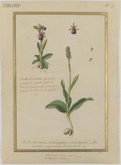 1/ Orchis orientalis, calyptra purpurea, Coroll I R Herb 30 2/ O orientalis, anthropophora, Coroll I R Herb 31, Aubriet (Claude).Collection du MNHN-Paris - Direction des bibliothèques et de la documentation