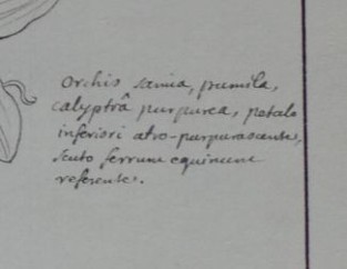 Orchis Samia, pumila, calyptra purpurea, petale inferiori atro-purpurascente, scuto ferrum equinum referente, détail.