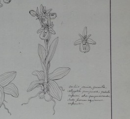 Orchis Samia, pumila, calyptra purpurea, petale inferiori atro-purpurascente, scuto ferrum equinum referente. Aubriet (Claude). Ms 78. Collection du MNHN-Paris - Direction des bibliothèques et de la documentation
