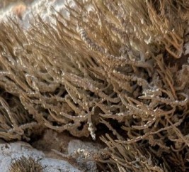" Lichen saxatilis polypoidus tinctorius. Les rochers les plus élevés de l’île sont couverts de cette plante, ainsi que ceux de Nicouria. Elle sert aux teintures. On m’assura qu’on la vendait 10 écus le quintal à Alexandrie. Mr Pomet me la fit voir à Paris comme une chose rare, qu’il avait reçue de Hollande. Ce lichen est long de 2 pouces ou 2 pouces et demi. Il croît par bouquets grisâtres, dont les brins les plus courts ont à peine un pouce, et ne sont guère plus épais que du crin, divisés en 2 ou 3 petits cornichons. Les plus longs sont ordinairement fourchus, déliés à leur naissance, arrondis, raides, mais épais de près d’une ligne dans la suite, presque courbés en faucilles, quelquefois fourchus au bout, garnis dans leur longueur d’un rang, rarement de deux rangs, de cotylédons un peu caves, plus blancs que le reste, de demi-ligne de diamètre, élevés en petites verrues, ce qui fait qu’ils ressemblent aux pieds du Polype de mer. Ces brins, cassés, sont blancs et solides au-dedans, tant soit peu salés. "