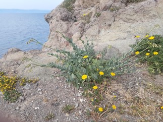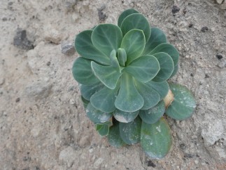 Cette plante sort des fentes des rochers et pousse des tiges hautes d’environ deux pieds, fermes, droites, dures, cassantes, épaisses de 3 lignes, vert de mer, solides, accompagnées de gros nœuds à chacun desquels naissent 2 feuilles, opposées vis à vis, longues de deux pouces sur un pouce et demi de large, étroites à leur naissance, larges vers le milieu jusqu’à un pouce ou 15 lignes, arrondies à la pointe en arcade gothique. Ces feuilles sont vert de mer, charnues, épaisses de demi-ligne, cassantes, remplies d’une chair vert pâle, lisses, d’un goût d’herbe un peu salé, gluantes et mucilagineuses quand on les mâche bien. Celles qui naissent dans la suite ont la base plus arrondie et commencent partagées en deux oreillettes relevées en-dessous d’une grosse côte charnue. Les dernières sont de même, mais elles sont plus pointues. Le haut de cette tige se divise en branches nues. Elles n’avaient point de fleurs dans ce temps-là. Les fruits sont des capsules soutenues sur des queues longues de 7 ou 8 lignes. Chaque capsule est une coque en poire, longue de demi-pouce sur 4 ou 5 lignes de large, roussâtre, dure, cassante, qui s’ouvre à la pointe en 5 ou 6 parties raides, disposées en étoile. Elle renferme des graines qui ont la forme d’un petit rein, longues d’une ligne, grisâtres, ridées. Le calice est grisâtre aussi, membraneux et collé sur les capsules."